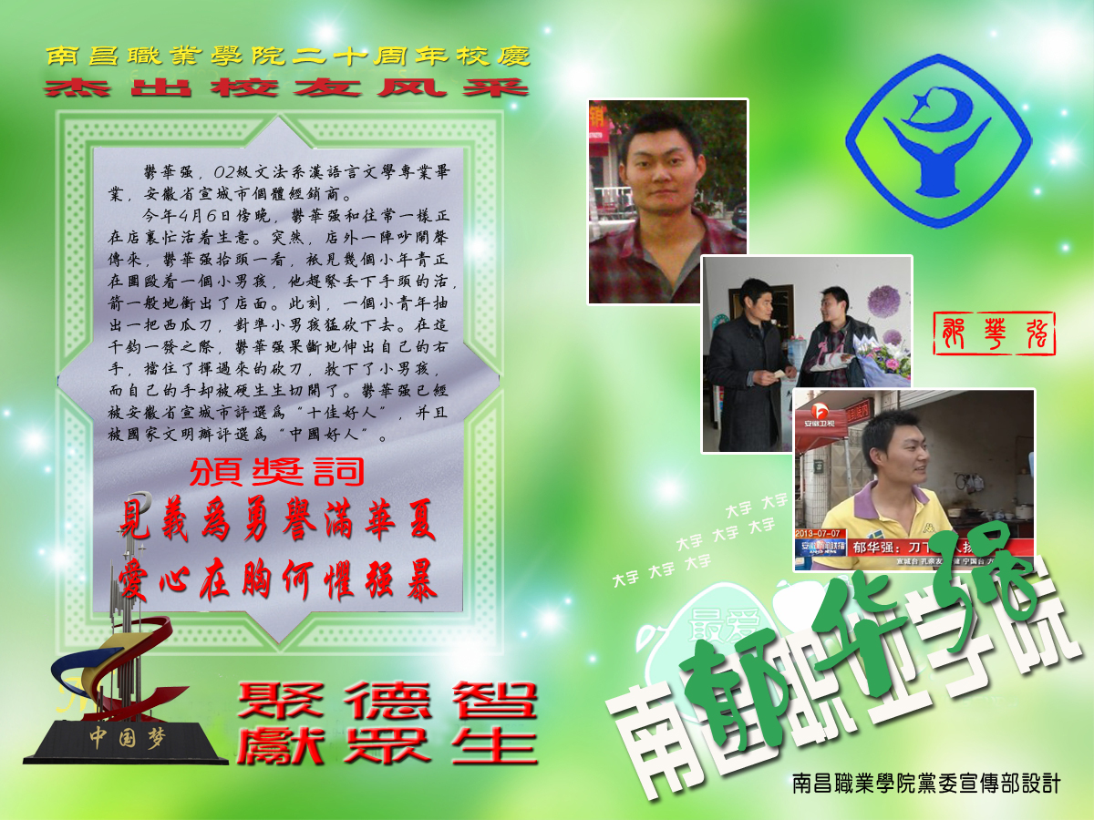 2013年中国好人榜之“全国十大见义勇为模范”获得者——郁华强(我院02级汉文41班毕业)