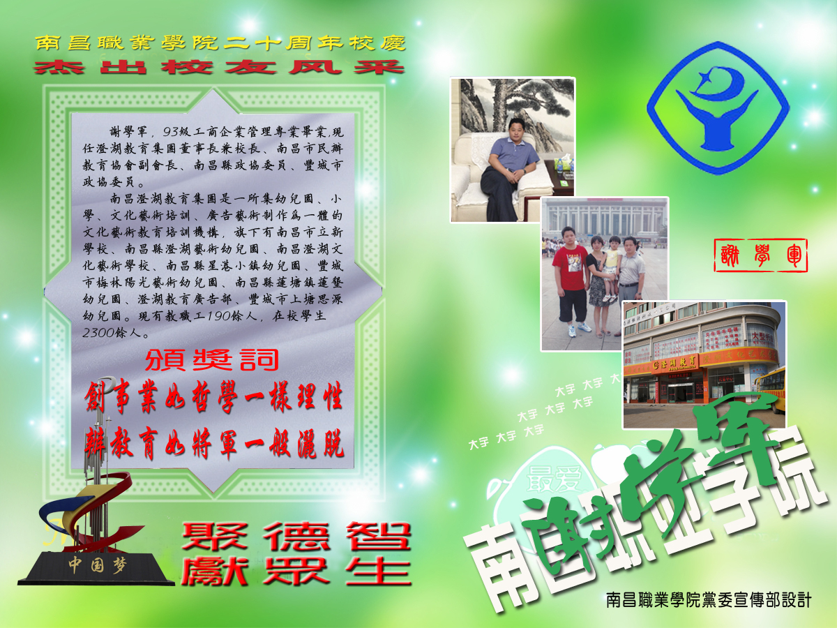 南昌市民办教育协会副会长、南昌澄湖教育集团董事长兼校长——谢学军(我院93级工商企业管理专业毕业)
