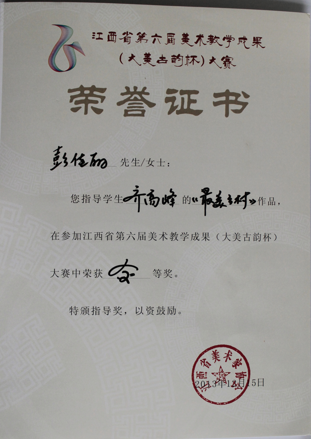 齐高峰的《最美乡村》获得金奖,指导老师彭佳丽;