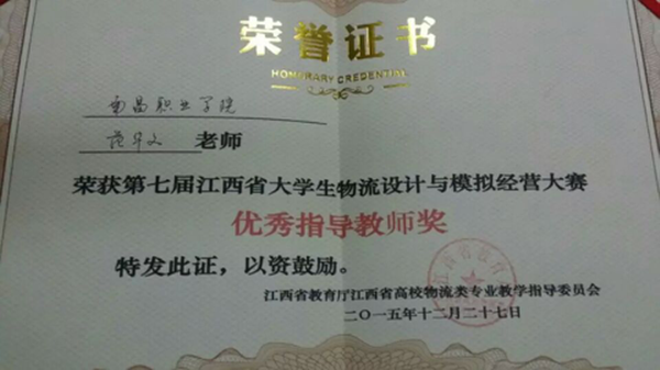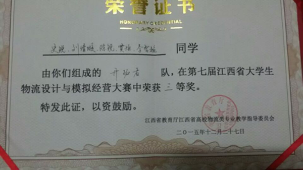 本网讯 经管系 刘博雅 报道 2015---2016年度,南昌职业学院经济管理系在院领导的大力支持下,在系领导的认真带领下,在师生的共同努力下,创下许多优秀的成绩。12月24日,物流管理专业两支队伍在范华文老师、喻正义老师的带领下,参加了第七届江西省大学生物流设计与模拟经营大赛,他们在经管系实训楼针对大赛进行了为期两周的培训。在训练过程中,老师们认真辅导,同学们积极训练,功夫不负有心人,经过认真地训练与团队的配合,在本次比赛中,参赛队伍均获得江西赛区两个三等奖,老师们获得一个优秀组织奖(全省共三个)。