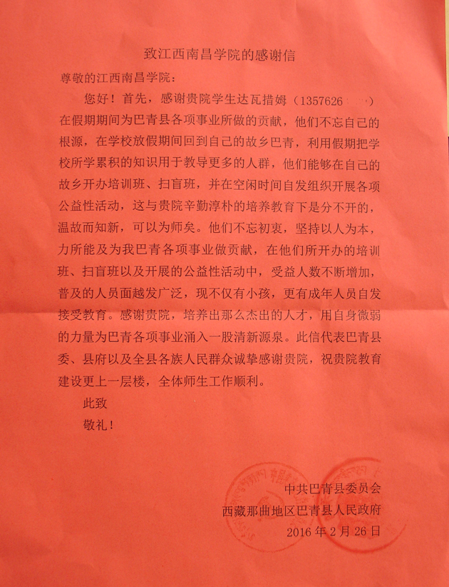附:中共西藏自治区那曲地区巴青县委和县政府致南昌职业学院党委宣传部的感谢信