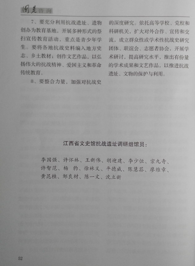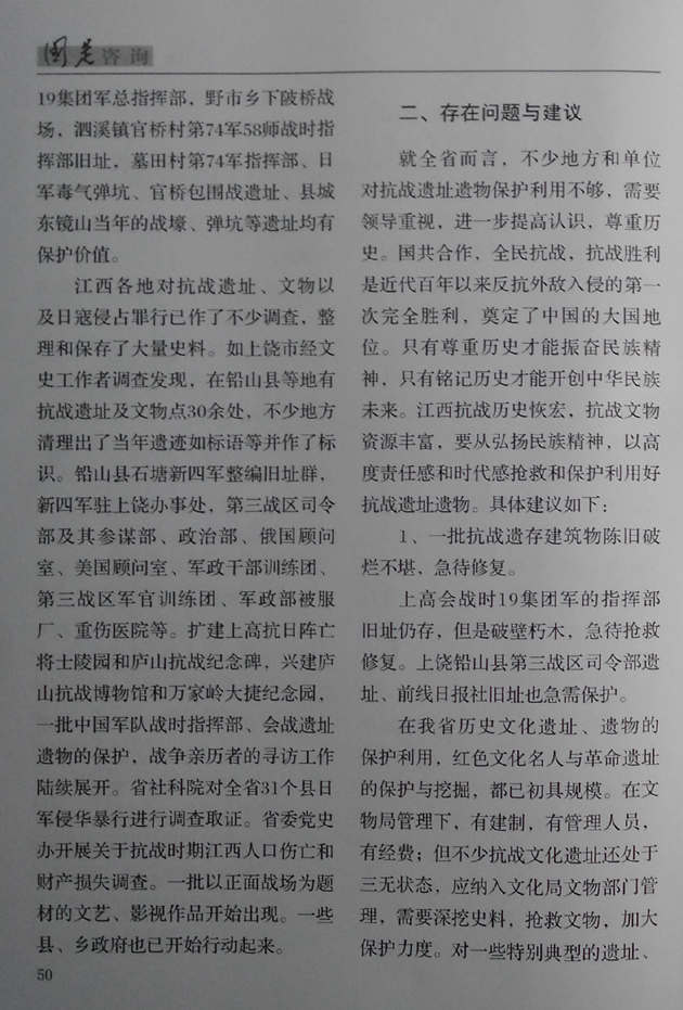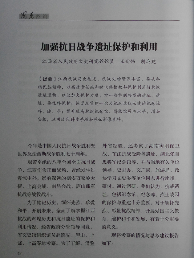 王新伟撰写的《加强抗日战争遗址保护和利用》分“抗战遗址的保护和纪念馆、碑、陵园的建设取得了一定成绩”和“存在问题和建议”两个章节,在“存在问题和建议”章节中,王教授有针对性的提出了自己的八条建议。《国是咨询》杂志由国务院参事室和中央文史研究室主编,读者为中共中央政治局、书记处成员;国家主席、副主席;全国人大委员长和副委员长;国务院总理、副总理、国务委员、秘书长;全国政协主席和副主席,以及中共中央办公厅、全国人大常委会办公厅、国务院办公厅、全国政协办公厅;中共中央组织部、中共中央宣传部和中共中央统战部等级别的部门。王新伟教授是江西省政府文史馆馆员、中国美术家协会会员、中国高等教育美育研究会理事、中华美学会会员、江西赣文化研究会常务理事。江西省文化发展与中国绘画风格演变学术带头人、江西省美术学学科带头人。