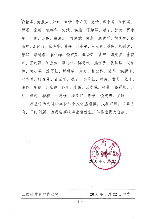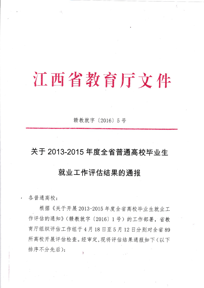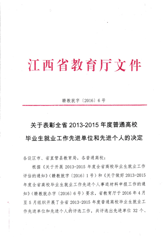 江西省教育厅于2016年4月至5月组织开展了全省2013-2015年度普通高校毕业生就业的评估工作。经过紧张严肃的评选,据教育厅《关于开展2013-2015年度全省普通高校毕业生就业工作评估结果的通报》(赣教就字〔2016〕5号)及《关于表彰全省2013-2015年度全省高校毕业生就业工作先进单位和先进个人的决定》(赣教就字〔2016〕6号)两份文件中获悉,南昌职业学院荣获优秀等级学校,章志伟副院长、就业办陈慧银副科长荣获先进个人。
