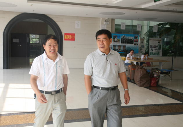督导专员、党委书记万普海(右)在接待大厅检查新生接待工作的准备情况