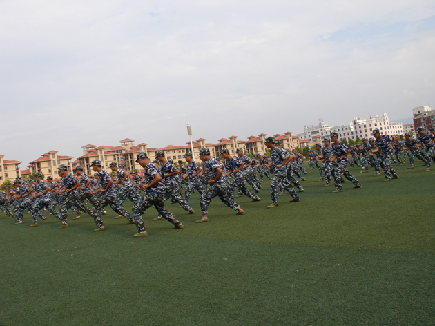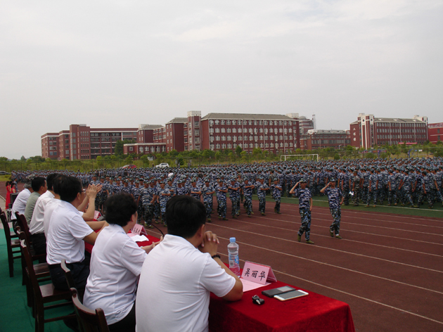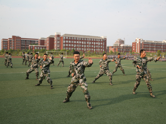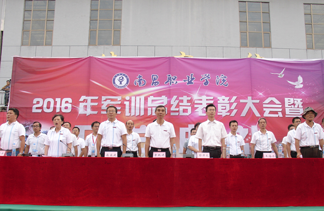 南昌职业学院2016级新生军训总结表彰大会在雄壮的国歌声中开始,全体参训的学员以连为单位,在教官的带领下,踏着《中国人民解放军进行曲》依次正步通过主席台,接受校领导的检验,汇报自己经过12天军训的成果。由女新生组建的方队,规范地展示了各种队列动作;由男新生组建的方队,表演了刚劲有力的军体拳;教官队的部分男队员表演了擒拿格斗术。