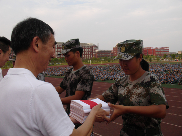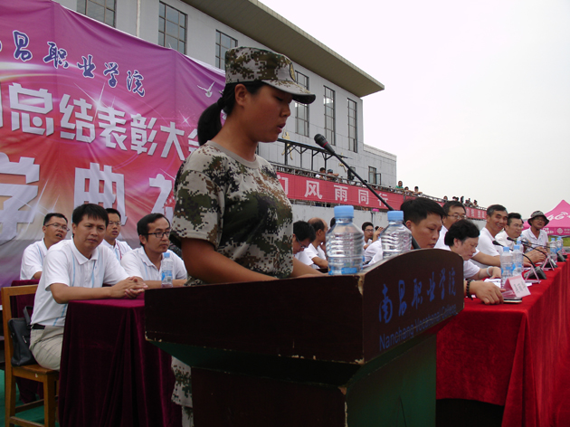 四营37连的教官肖雪代表参加军训的教官发言。她说,今年军训任务重,压力大,参加军训的学员多,但我们不怕。当我们看到学员走出了规范的军姿,知道了纪律的严肃,懂得了荣誉的崇高,明白了友情的珍贵,我们的心里是无比的兴奋。我们全体教官可以自豪地向学院领导报告,我们没有辜负各级领导关心和期望。