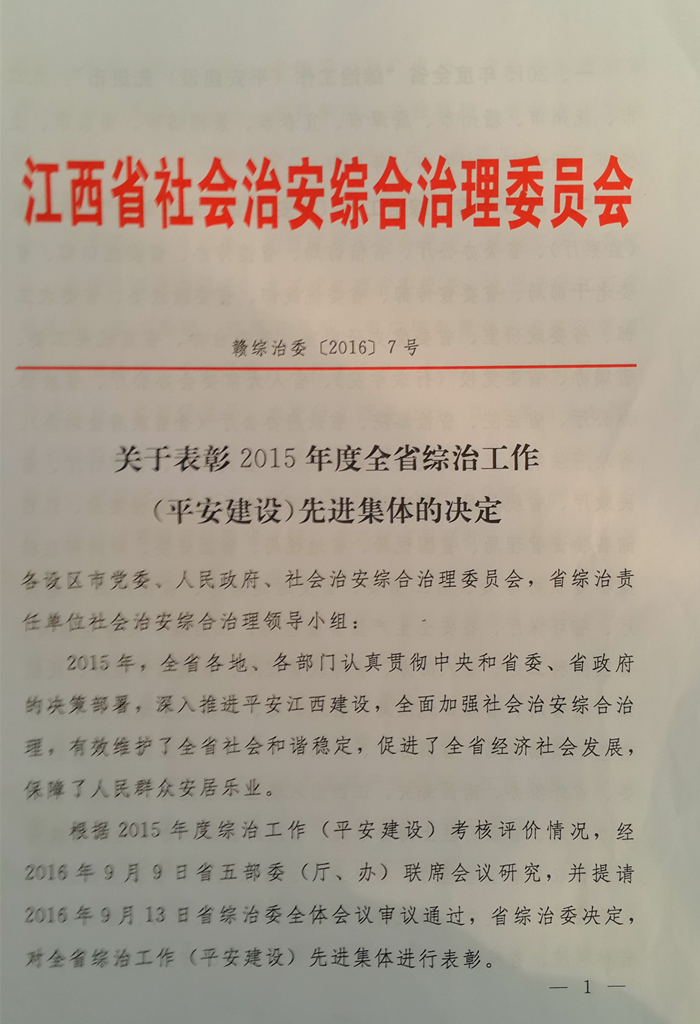 本网讯 党委宣传部 黄彦斌 报道 9月17日,江西省社会治安综合治理委员会下发了《关于表彰2015年度全省综治工作(平安建设)先进集体的决定》(赣综治委【2016】7号),我院荣获“全省综治工作(平安建设)先进单位”,这也是我院连续两年获此殊荣。